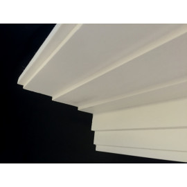Stepped cornice with sharp angles projects 90mm onto the ceiling and down the wall 45 mm. Ideal for lower ceiling heights .